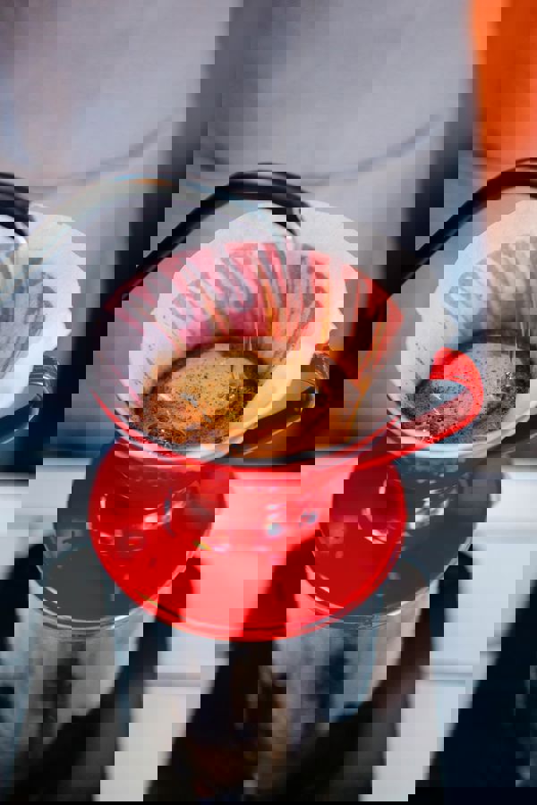 Place your filter in the dripper and rinse it with hot water. This removes any papery taste and preheats the dripper. Make sure to discard the rinse water before adding your coffee.
